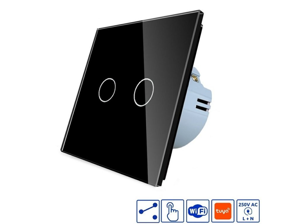 Vypínač funguje ve standardní elektrické síti 230V a využijete, když budete potřebovat ovládat osvětlení ze dvou nebo více různých míst. Je značený jako řazení č.6+6 popřípadě jako vypínač č. 5B+ s možností ovládání přes wifi a aplikaci TUYA